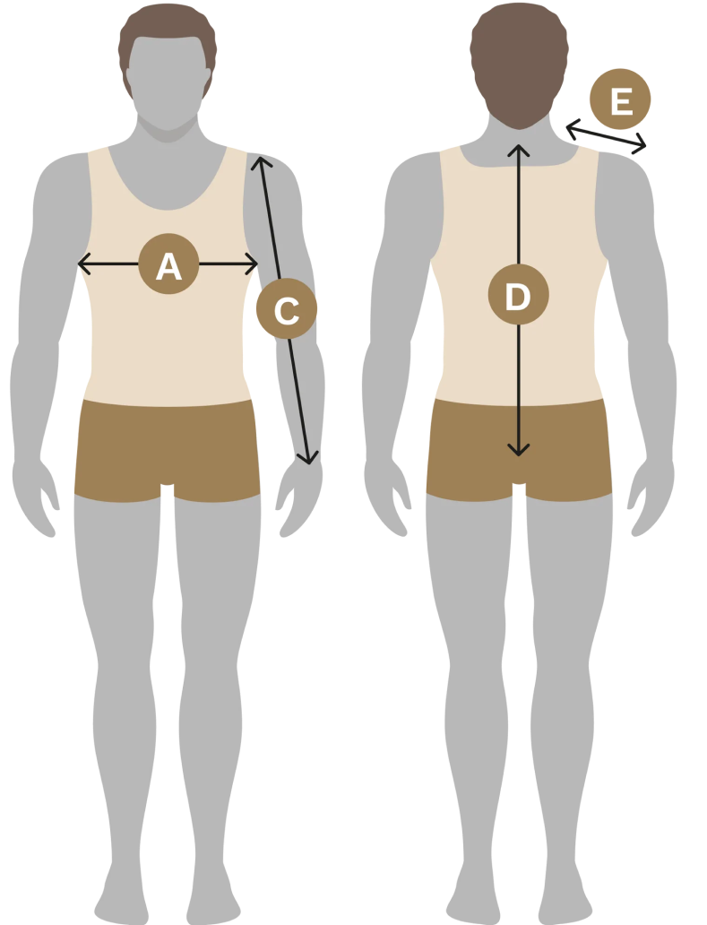 Measure from your underarms all the way round the circumference of your chest at the widest point, this will give you your chest size. A standard size Large would be a 44” chest for example, if you are an in-between size for example a 43” chest, we’d advise to go up a size rather than down – although this is YOUR choice.